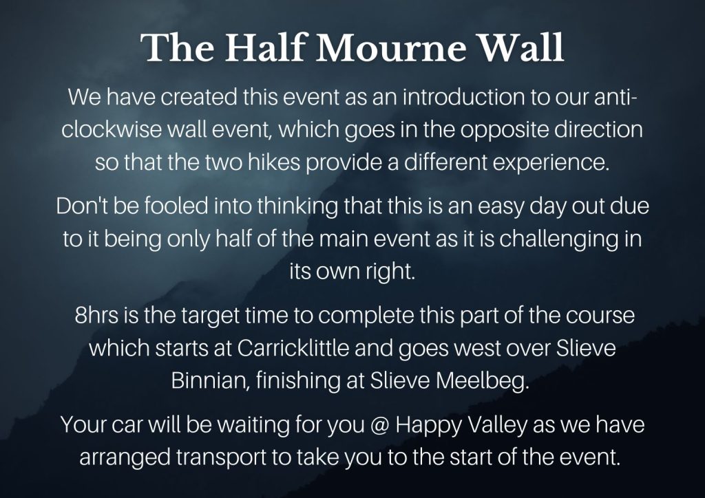 29mar7:30 am4:30 pmHalf Mourne Wall pt 1 Challenge, The Mournes March7:30am Happy Valley Car Park, The Mournes