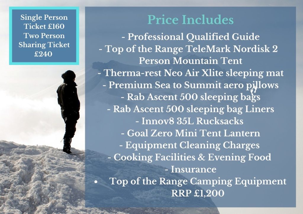 The cost shown is for a single person in a 2 person tent, the cost for 2 people sharing is £240 (please send an enquiring if looking to book 2 people).